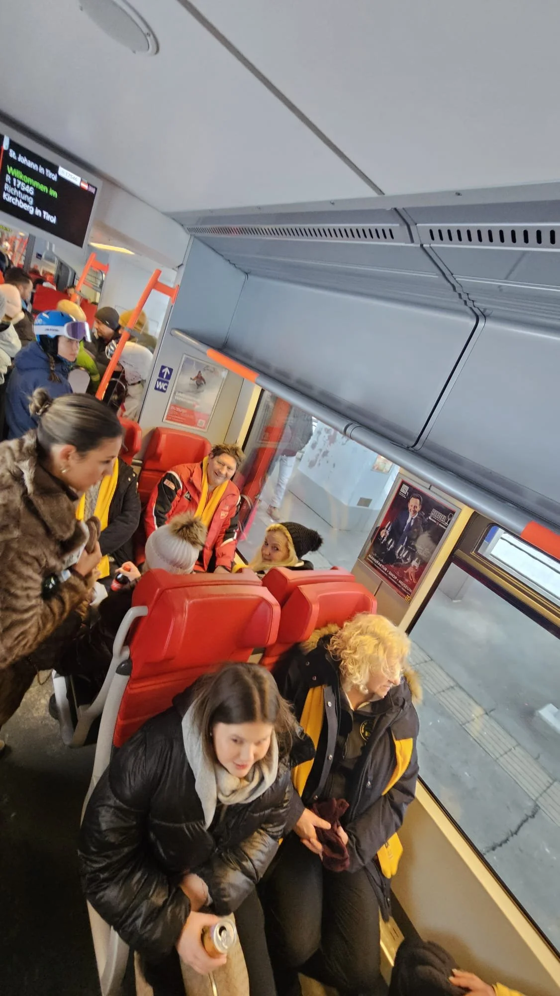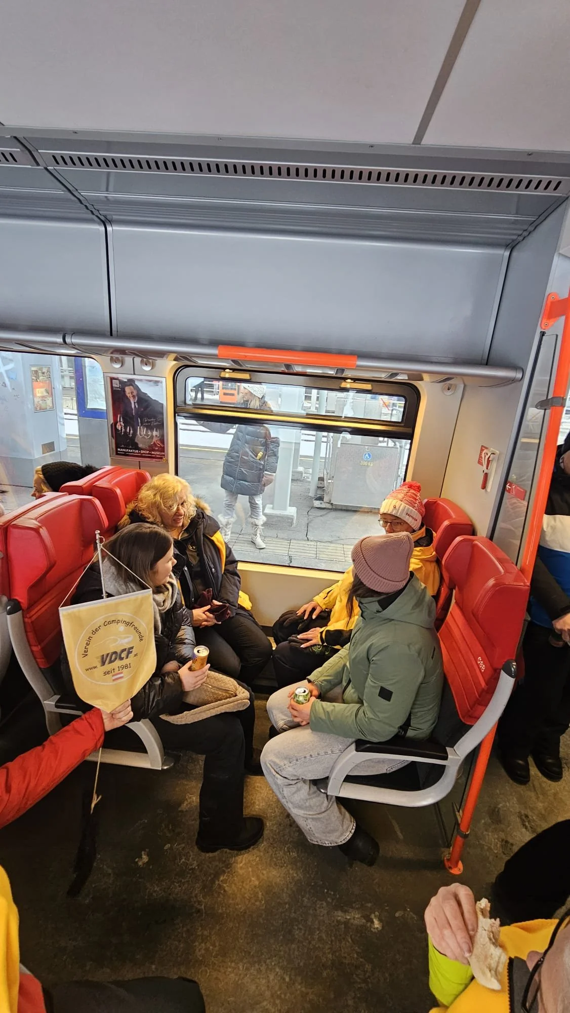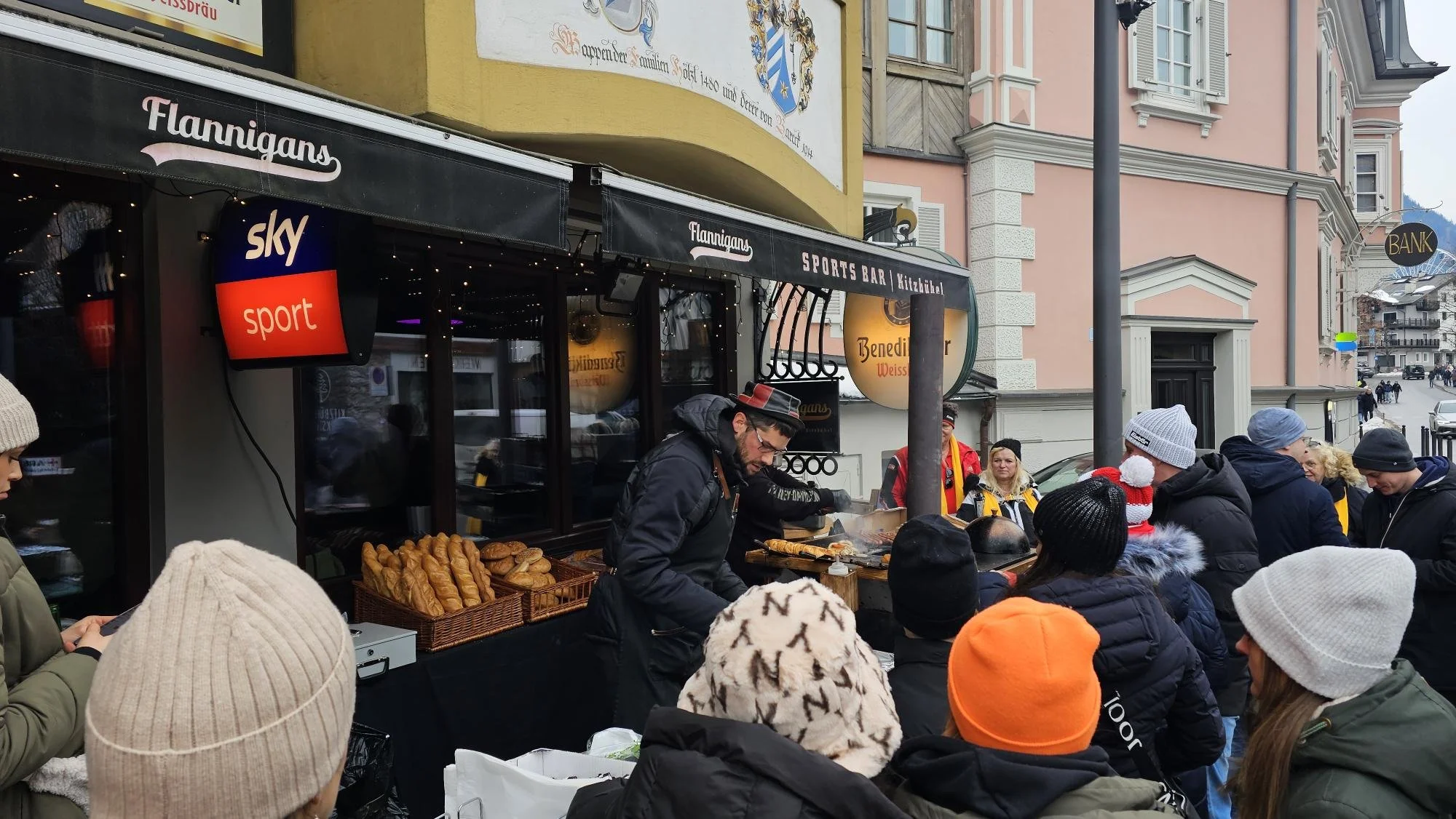 Samstag begann der Tag mit einem kräftigen Frühstück, der Club spendierte wieder die Semmeln und ein Bier für den Nachmittag. Nach unserer Stärkung ging es leider ohne Walter, der sich beim Schifahren verletzt hatte, zum Bus. Der uns zur Bahn brachte. Danach fuhren wir mit dem Zug ins Ziel Stadion der Streif.